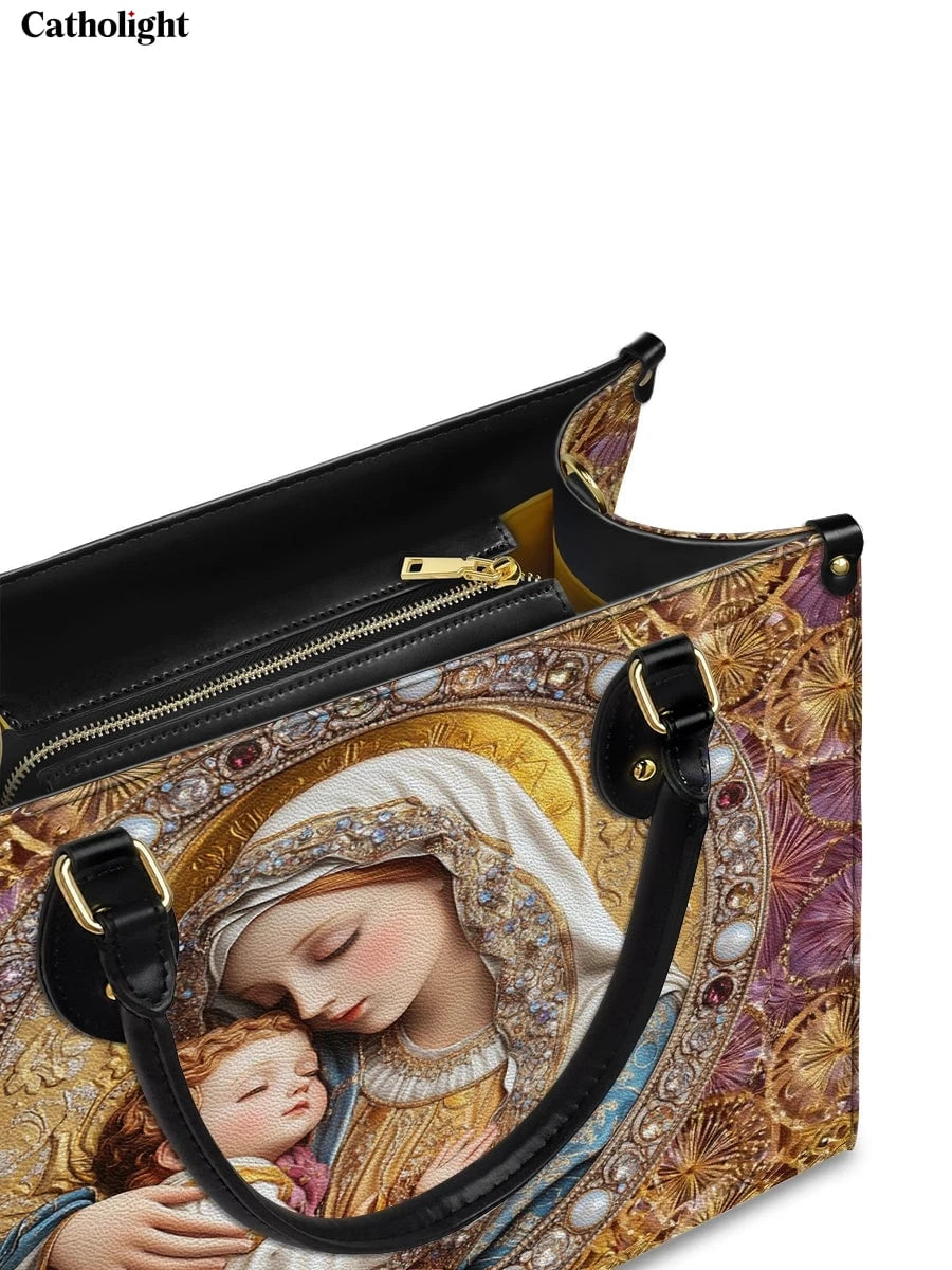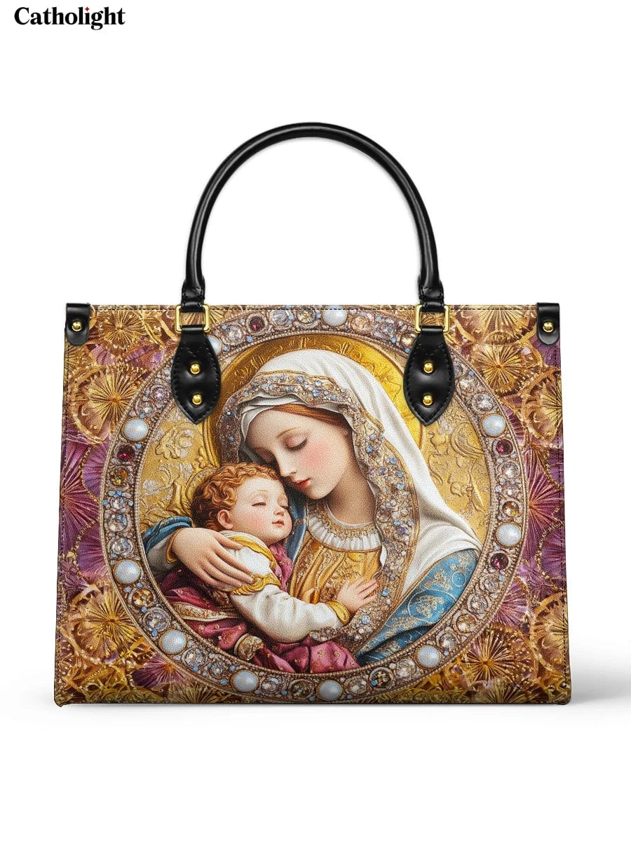 Lleva contigo un símbolo de amor y devoción con este bolso de mano bellamente elaborado. Su diseño intrincado y vibrante muestra una representación detallada de la Virgen y el Niño, rodeados por un delicado marco dorado y perlas ornamentadas. Cada detalle ha sido cuidadosamente pensado para transmitir serenidad y el vínculo eterno entre madre e hijo.