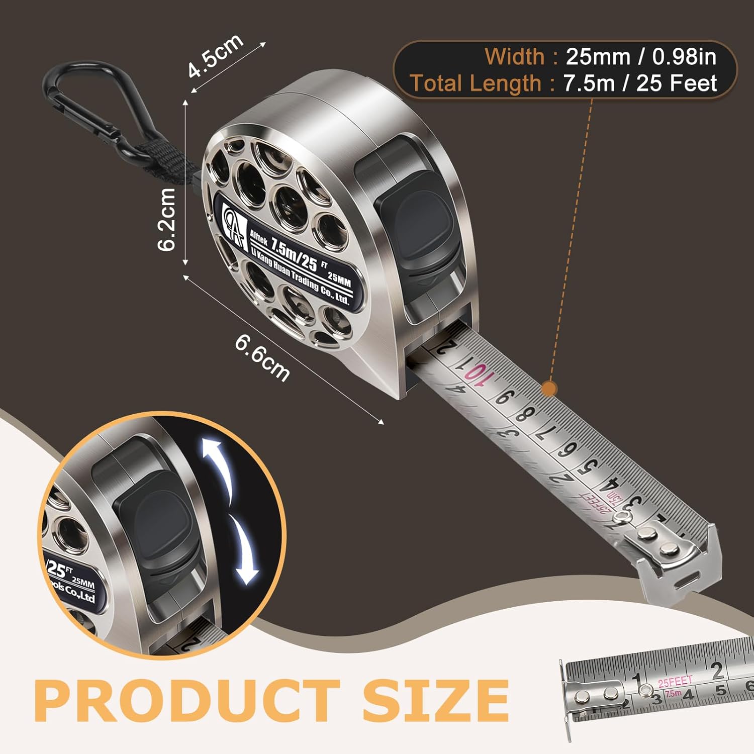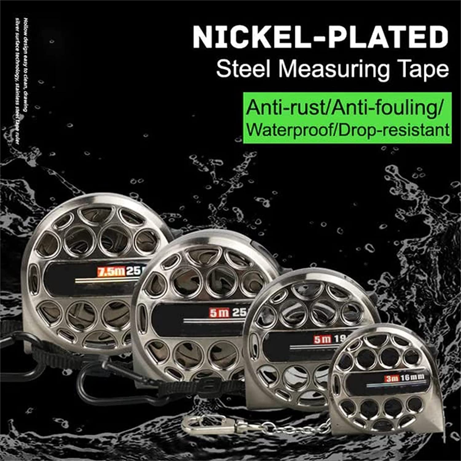 Fabricada con acero inoxidable de alta resistencia, esta cinta métrica es capaz de soportar los desafíos más duros, gracias a su fuerte resistencia a los impactos y su proceso de revestimiento avanzado que previene la oxidación.