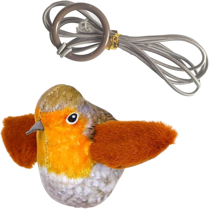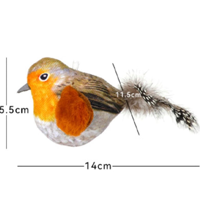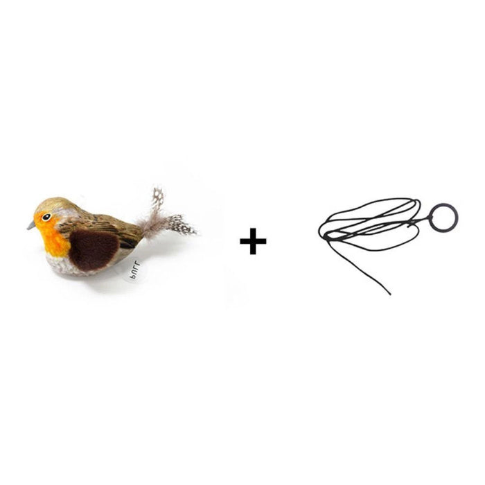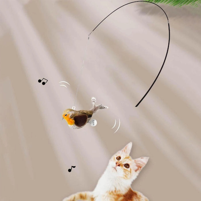El pájaro emite sonidos auténticos que imitan los de un ave real, atrayendo instantáneamente la atención de tu gato y despertando su instinto de caza.