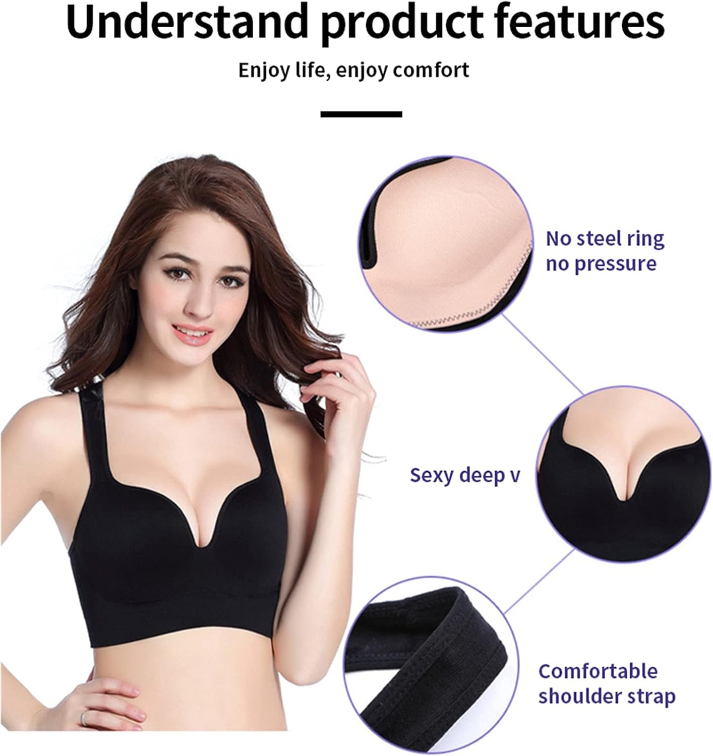 SIN COSTURAS NI AROS MOLESTOS: Este bra está diseñado sin aros, lo que significa que puedes lucir tu escote sin las incomodidades tradicionales de los sujetadores con varillas.