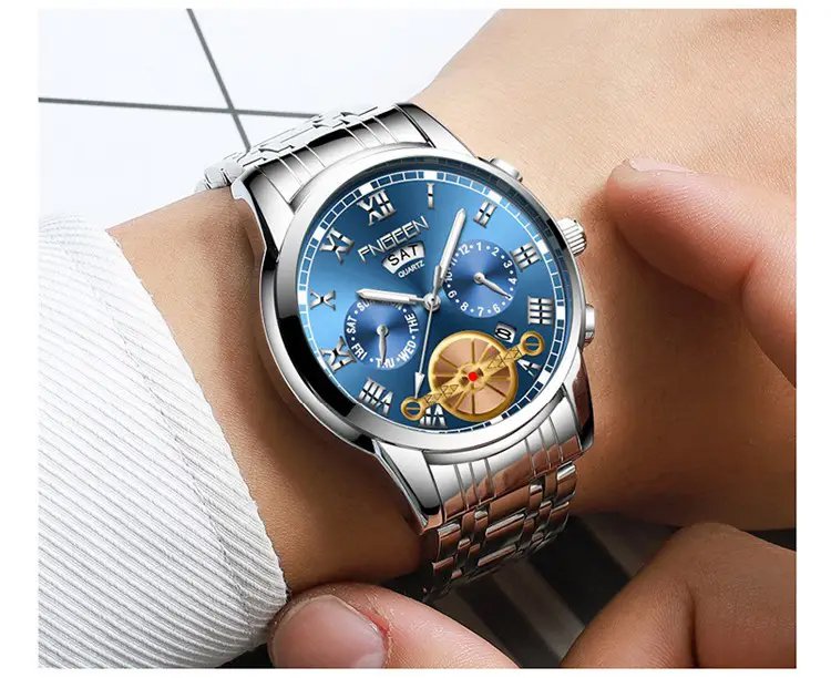 Fecha: El reloj cuenta con una ventana de fecha ubicada a las 3 en punto, ofreciendo una manera conveniente de mantenerse informado sobre la fecha actual sin necesidad de un calendario adicional.