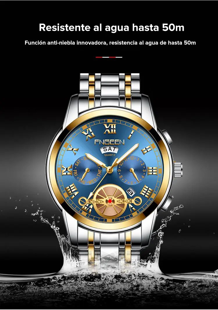 Resistencia al Agua: Con una resistencia al agua de 5 ATM (50 metros), este reloj es adecuado para soportar salpicaduras y breves inmersiones en agua. No obstante, no se recomienda su uso para natación o buceo.